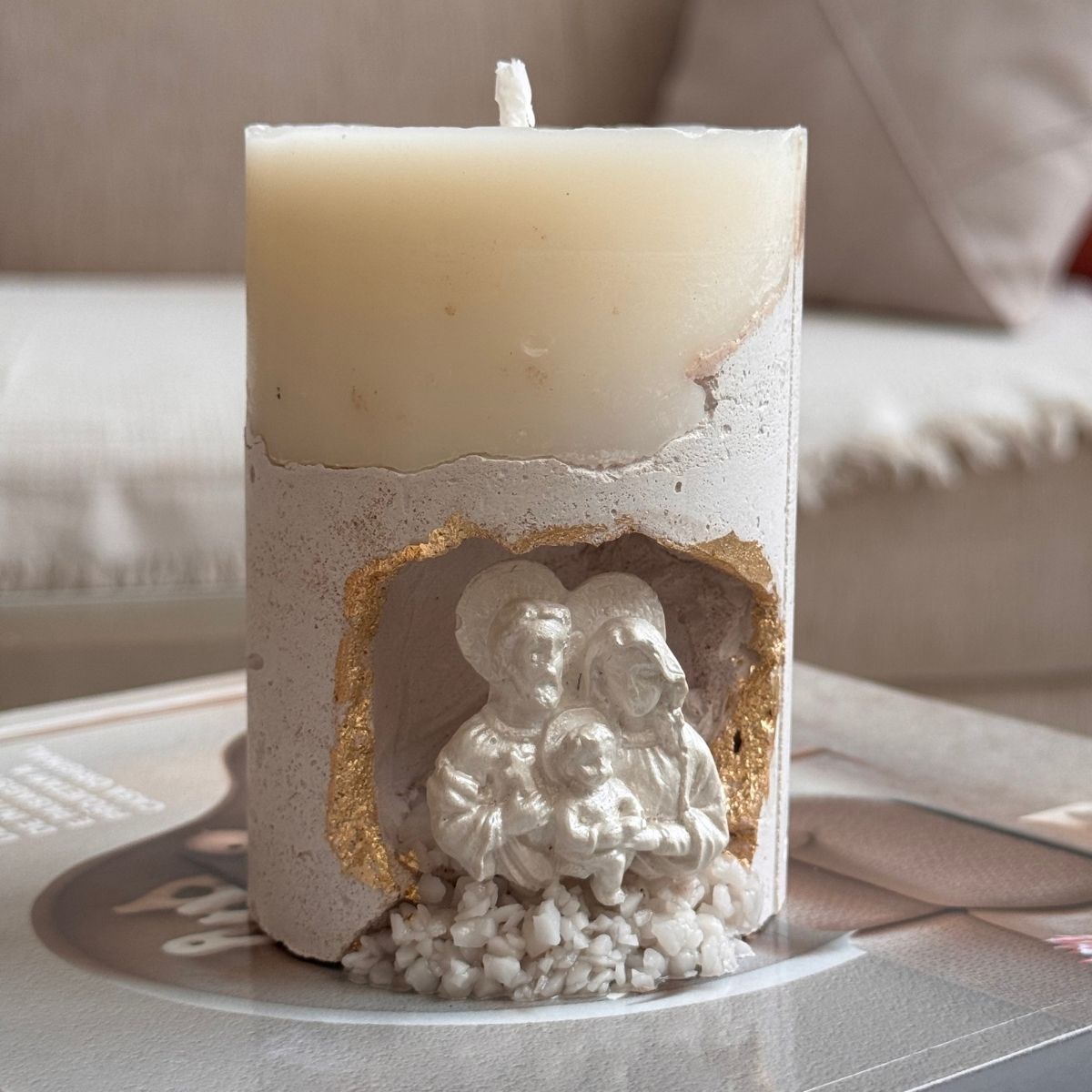 Celebre a fé, a delicadeza e o aconchego com a nossa vela artesanal Sagrada Família, feita à mão com base de cimento, detalhes em folha de ouro e mini escultura em gesso artístico. Uma peça que vai além da decoração – é símbolo de paz, amor e espiritualidade. Disponível em dois tamanhos: